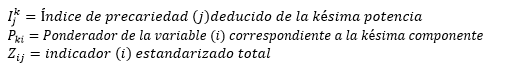 Una vez establecida la operacionalización de las variables para la construcción del índice, el resultado es un valor con un rango de 0 a 1. Mientras más se acerca a uno implica que existe mayor precarización y viceversa. La forma de cálculo del índice de precarización fue aplicada mediante la fórmula: