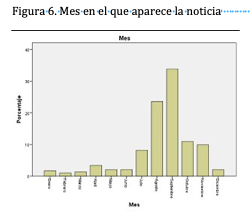 Durante el período analizado se ha contabilizado en los diarios estudiados un total de 293 piezas periodísticas sobre cultivadores de cannabis, distribuidas de la siguiente manera: La Voz de Galicia (7,5%), El Mundo (5,8%), Diario de Sevilla (4,4%), El Correo Gallego (3,8%), Diario de Navarra (3,8%), Ideal (3,4%), Hoy, Diario de Extremadura (3,4%). El 67,9% restante de las noticias provienen de los 94 medios de comunicación distintos. Los meses de septiembre (33,8%) y agosto (23,5%) acumulan el mayor número de noticias publicadas. Febrero es el mes en el que se ha recogido un menor número de piezas (1%) (Figura 5). Esto se debe a que el mes de septiembre es el momento de la cosecha.