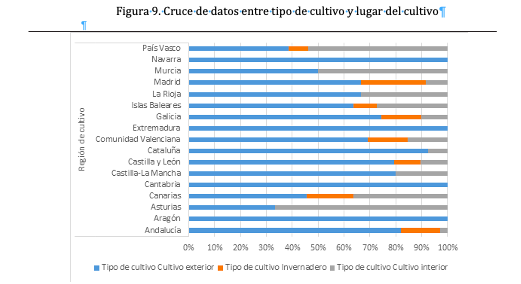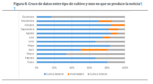 Al cruzar los datos sobre el tipo de cultivo y el mes en que se produce la noticia, obtenemos que la información sobre el cultivo de cannabis se produce en los meses de agosto y de septiembre, principalmente de cultivo exterior. Por el contrario, los meses de marzo y de diciembre se producen más artículos sobre cultivos de interior (Figura 8). El patrón identificado en la cobertura mediática de noticias sobre cultivos de cannabis se debe a la estacionalidad de la actividad de cultivo, la visibilidad de los cultivos al aire libre y otros factores regionales y climáticos. Estos patrones pueden explicar por qué la cobertura de noticias varía a lo largo del año según el tipo de cultivo (ver Figura 8).