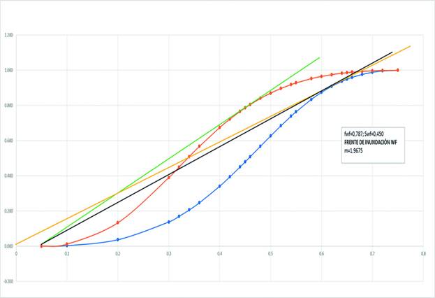 Se aplicó el modelo de Buckley-Leverett, complementado por el enfoque dado por Weldge, determinando la saturación de agua en el frente de agua (Sfw) y la saturación de agua promedio detrás del frente (Swbtm) (Mena, 2019). (Ver figura 6)