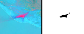 Imagen izquierda es una imagen satelital del Volcán Sangay obtenida del satélite GOES-16 el 9 de marzo de 2021 (IG-EPN, 2021), para la predicción del modelo. Imagen derecha es una imagen segmentada que delimita el contorno de la ceniza del Volcán Sangay.
