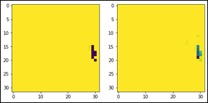 Izquierda: imagen segmentada del output. Derecha: imagen de validación segmentada. Los píxeles de color morado y verde indican la existencia de ceniza, los píxeles en amarillo no presentan ceniza