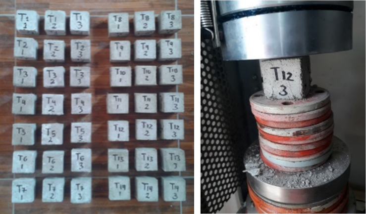 La resistencia a la compresión simple (Fig. 3) se realizó mediante la metodología establecida por la norma NTE INEN 488. El procedimiento consistió en aplicar una carga progresiva en especímenes cúbicos de mortero de arista: 5 cm y determinar su resistencia máxima admisible a los 28 días.