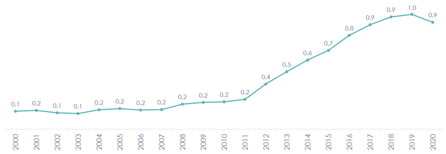 La salud mental en Ecuador ha sido marginada en la política pública, ya que la ley de salud expedida en 2008 no ha experimentado cambios significativos. Esto resulta alarmante, considerando que la sociedad ha evolucionado en los últimos 14 años y según la Asamblea Mundial de la Salud (2013), la salud mental se define como "un estado de bienestar en el que una persona puede desarrollar sus habilidades, superar el estrés normal de la vida, trabajar de manera activa y productiva, y contribuir a su comunidad". Además, el presupuesto dedicado a la salud mental ha sufrido recortes, pasando de USD 3.693 millones en 2021 a USD 3.402 millones en 2022, lo que agrava la situación (Campaña, 2021). Paralelamente, la cantidad de profesionales de la salud mental, como psicólogos (Figura 5), ha disminuido en comparación con los años previos a la pandemia de COVID-19 (INEC, 2020).