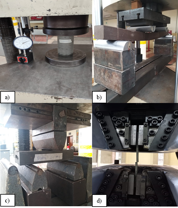 En la Figura 1 se muestran el equipo y las probetas ensayadas en la caracterización mecánica. Para los ensayos de compresión (Figura 1a), flexión (Figura 1b) y corte (Figura 1c) se usaron máquinas universales de 100 y 30 toneladas del laboratorio de ensayo de materiales y modelos de la Universidad Central del Ecuador (UCE). En el ensayo a tracción (Figura 1d) se usó la máquina universal de 500kN de la Escuela Politécnica Nacional (EPN).