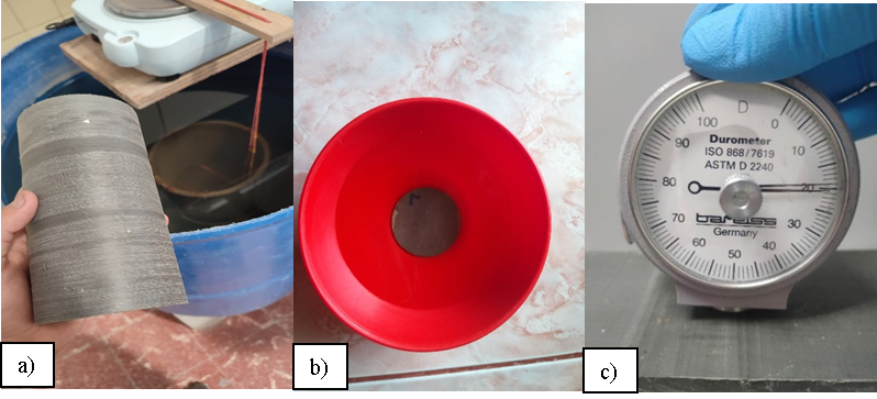 En la Figura 2 se muestra la determinación de las propiedades físicas de los materiales estudiados. Para la densidad (Figura 2a) se la determinó por el método gravimétrico, para la absorción (Figura 2b) se mantuvo inmersa la probeta en agua destilada y se registraba su peso periódicamente. En el caso de la dureza (Figura 2c) se la determinó con el durómetro en el Centro de Investigaciones Aplicadas a Polímeros (CIAP) de la EPN. Las probetas de los ensayos mencionados cumplen con las siguientes relaciones dimensionales de acuerdo con su normativa ASTM D 6111, 570 y 2240 respectivamente.