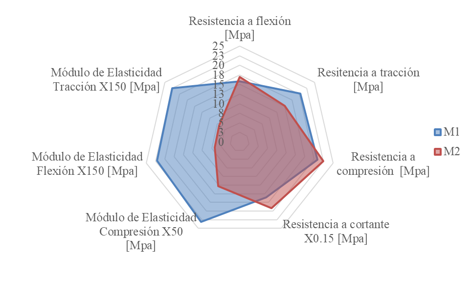 En un diagrama radial (ver Figura 4) se ha considerado las principales características mecánicas de los materiales estudiados, que son: resistencia a compresión, flexión, tracción, corte y los módulos de elasticidad a compresión, flexión y tracción. Se aprecia gráficamente las diferencias entre los valores obtenidos.