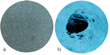 a (Sección transversal de la muestra M1 sin presencia de vacíos) y b (Sección transversal de la muestra M2 con presencia de vacíos).