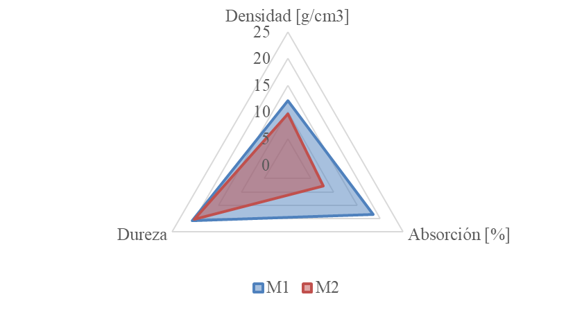 En la Figura 6 mediante un diagrama radial donde se considera las fundamentales características físicas como la densidad, absorción y dureza se muestra las diferencias que existe entre las dos muestras estudiadas.