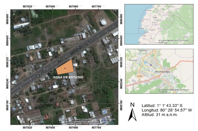 La zona de estudio escogida se encuentra georreferenciada en latitud 1° 1' 43.33'' S y longitud 80° 28' 54.57'' W, con una altitud de 31 ms.n.m. y se localiza en el sector El Negrital perteneciente a la parroquia 18 de Octubre en Portoviejo, Ecuador (Ver figura 1), donde se realizaron los estudios de mecánica de suelos.