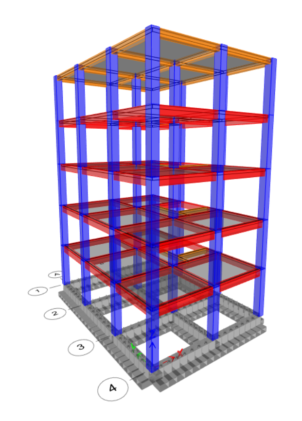 Se diseñó una estructura de hormigón armado de tipo residencial de cinco plantas, con dimensiones de 8,40 metros de ancho y 11,50 metros de largo, constituida por vigas, columnas, losas macizas y una cimentación de 7 zapatas corridas con un desplante (Df) de 0,80 metros y un ancho de zapata (B) de 1,20 metros. Los primeros cuatro niveles son departamentos unifamiliares y el último piso destinado a una zona de lavandería y eventos o reuniones. Los elementos estructurales, cargas muertas y cargas vivas de la estructura fueron prediseñados según la Normativa Ecuatoriana de la Construcción vigente (MIDUVI, 2014a, 2014b) y modelados en el software estructural ETABS 20 (Ver figura 3).