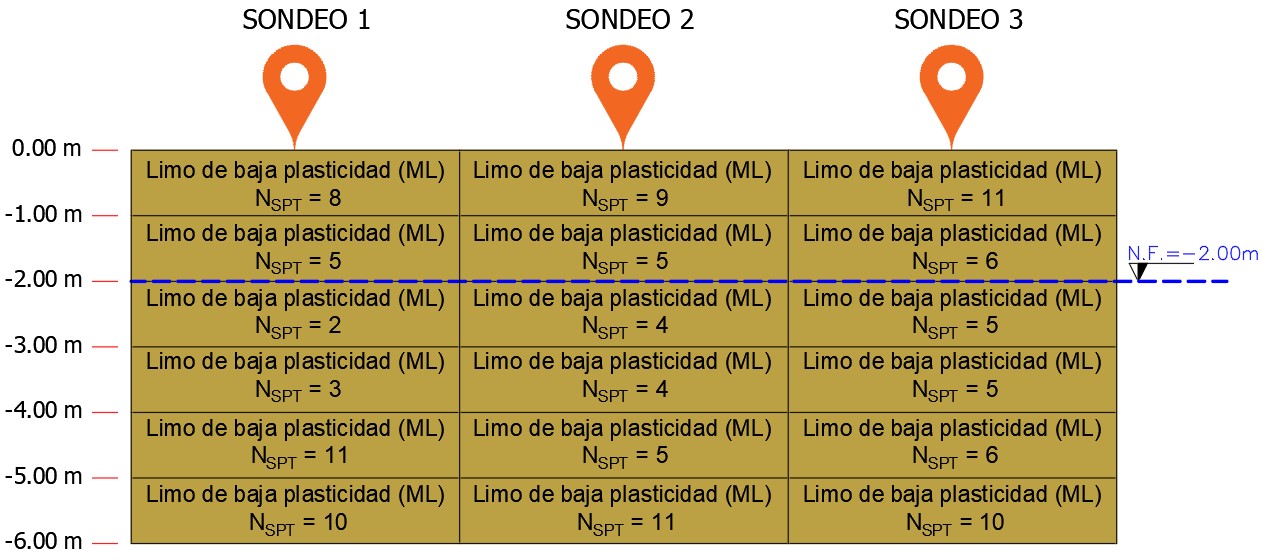 Con los resultados del ensayo SPT, se observa que el suelo es de tipo limoso con un nivel freático a 2 metros de profundidad y que no se superó los 11 golpes. Los suelos blandos que posean una humedad mayor al 40% y sus golpes SPT varía de 2 a 10 golpes SPT, se caracterizan por presentar baja resistencia al corte, alta deformabilidad y peligro de colapso (González de Vallejo, 2002). En la zona de estudio se realizó un ensayo Triaxial UU (No drenado - No consolidado) a una muestra del suelo y con los resultados se definieron los parámetros mecánicos como peso específico, cohesión y ángulo de fricción en condiciones no drenadas.