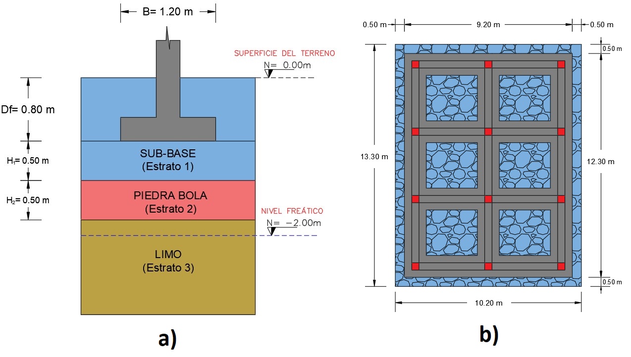 Con el propósito de contrarrestar los efectos del nivel freático y la humedad del suelo, se colocó un estrato de 50 cm de material granular (diámetro > 100 mm) conocido como Piedra Bola que servirá para prevenir el posible hinchamiento del limo saturado y logrará una base sólida de apoyo para los cimientos. Sobre el estrato de Piedra Bola, se dispondrá un segundo estrato de 50 cm de material grava-arena conocido como Sub-Base clase III, este material cumplirá una doble función que actuará como sellador para la Piedra Bola, y al mismo tiempo como un filtrante para el agua de las precipitaciones, por lo que se agregará el mismo material por encima de la zapata (Df).