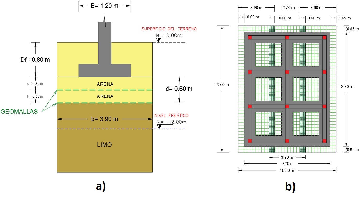 Las geomallas son materiales geosintéticos formados por nervios paralelos y perpendiculares conectados entre sí con aberturas que permiten el paso del suelo (Koerner, 2005). Son resistentes a procesos de degradación del suelo, debido a ser un material química y biológicamente inerte, además, para asegurar su calidad deben resistir rasgaduras, desgaste y punzonamiento (MTOP, 2013). La función principal de las geomallas es el refuerzo, al ser rígidas y tener aberturas de las geomallas lo bastante amplias, permiten una interconexión con el suelo o la roca adyacente, para reforzar o segregar ambos materiales (Das, 2011). Su uso crea una interacción geomalla-suelo que aumenta la resistencia al recibir, transmitir y repartir las cargas hacia el suelo de uniformemente, logrando un mejoramiento (Latha y Somwanshi, 2009). Las geomallas han tenido una mayor aplicación en proyectos viales, debido a sus impactos financieros positivos, reducción de espesores de movimiento de tierras y el aumento de la vida útil de los pavimentos (Sarmiento, 2017). Por estas razones, en este estudio se abordó su utilización para el reforzamiento del suelo bajo cargas producidas por un edificio de hormigón armado, diseñado con cimentaciones superficiales de zapatas corridas. Se llevó a cabo un análisis detallado que incluye el cálculo, la evaluación, y posteriormente, la comparación entre las alternativas de sustitución del suelo y el uso con geomallas.