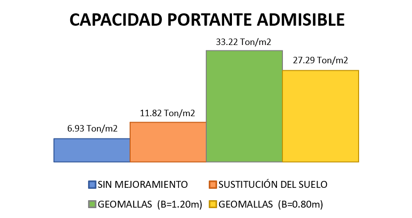 La capacidad portante admisible para la alternativa de refuerzos con geomallas y una zapata de ancho B=1,20 m (MODELO 3) es la más alta con un 379,43 % y posibilita un mejoramiento del 257,65% en desplazamientos verticales para la superestructura en comparación al suelo sin mejoramiento. La alternativa de refuerzos con geomallas con un B=0,80 m (MODELO 4) obtiene resultados superiores a la alternativa de sustitución del suelo con un B=1,20 m (MODELO 2).