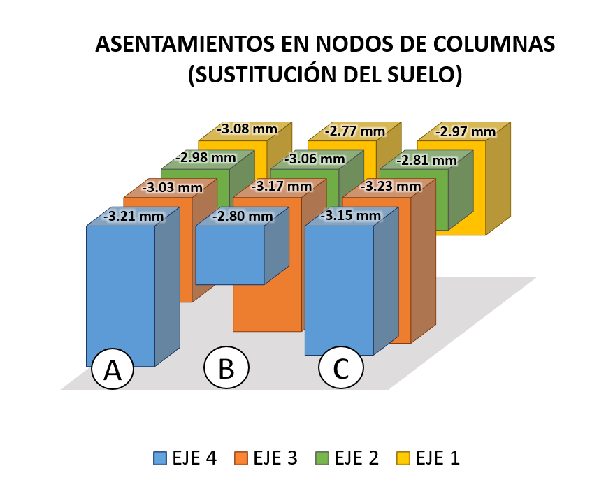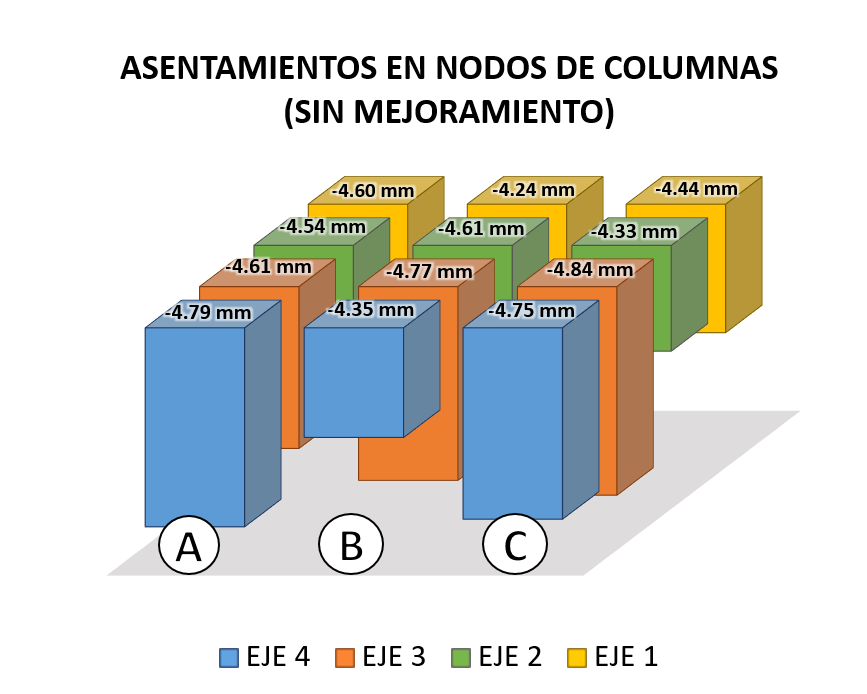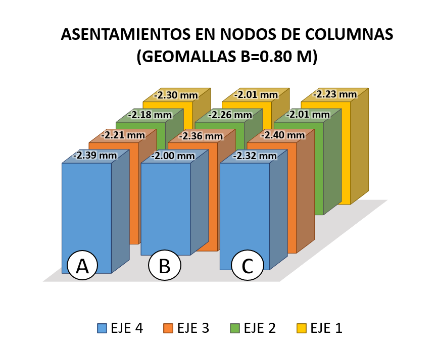 Los asentamientos en los nodos en las columnas están directamente relacionados con la capacidad portante del suelo; esto implica que, a medida que la capacidad portante del suelo aumenta, los asentamientos en la cimentación de la edificación disminuyen. Las alternativas de refuerzos con geomallas posibilitan una mayor disminución en los asentamientos inmediatos por causa de la capacidad de rigidez y confinamiento que ofrecen las geomallas al material granular.