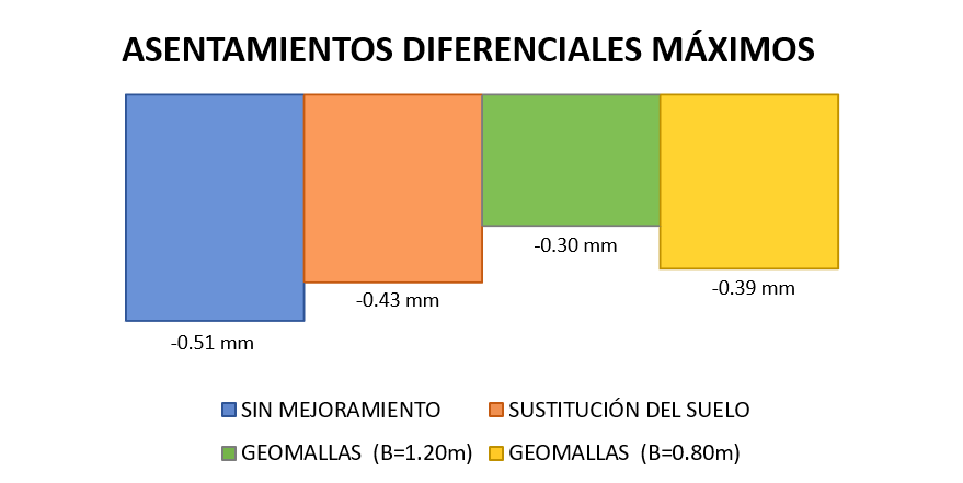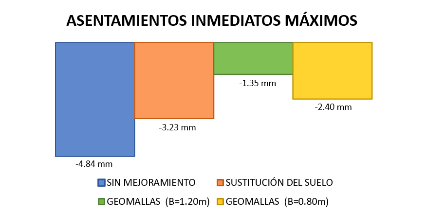 La utilización de geomallas en lugar de la sustitución del suelo, permite reducir las dimensiones del ancho de la zapata y el espesor de reforzamiento, al mismo tiempo que proporciona altos valores de capacidad portante y minimiza los asentamientos inmediatos y diferenciales, estos últimos se destacan como los resultados más relevantes, debido a que dichos asentamientos producen fuerzas internas que pueden afectar gravemente a los elementos estructurales.