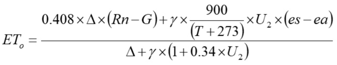 En donde: ET0 es la evapotranspiración referencia (mm d-1); Rn, radiación neta en la superficie del cultivo (MJ m-2 d-1); G, flujo del calor de suelo (MJ m-2 d-1); U , velocidad del viento (m s-1); ea, presión real de vapor (kPa); es, presión de vapor de saturación; Δ, pendiente de la curva de variación de la presión (kPa oC-1); T, temperatura promedio (oC); ɤ, calor latente de vaporización (kPa oC-1).