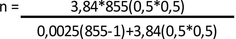 N = tamaño de la población, 855 e = margen de error, 0,05 Reemplazando datos: