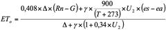 Donde: ET0es la evapotranspiración de referencia (mm d-1); Rn, radiación neta en la superficie del cultivo (MJ m-2 d-1); G, flujo del calor de suelo (MJ m-2 d-1); U2, velocidad del viento (m s-1); ea, presión real de vapor (kPa); es, presión de vapor de saturación; Δ, pendiente de la curva de variación de la presión (kPa °C-1); T, temperatura promedio (ºC); ɤ, constante psicométrica (kPa oC-1); Z, elevación sobre el nivel medio del mar; λ, calor latente de vaporización (MJ kg-1).