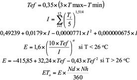 Donde: I es el índice de calor anual; Ti, la temperatura promedio mensual (°C); Tef, la temperatura efectiva (°C); E, la evapotranspiración mensual sin ajustar (mm m-1); Nd, el número de días del mes; Nh, la duración astronómica del día (h); ET0, la evapotranspiración mensual corregida (mm mes-1).