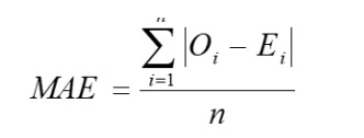 Error medio absoluto (MAE, mm mes-1), utilizado para establecer la diferencia que existe entre una variable medida con relación a una estimada, es el promedio de todos los errores absolutos; cuando este valor tiende a cero, el error es menor entre la variable medida y la estimada, el valor óptimo es igual a cero (Chai & Draxler, 2014).