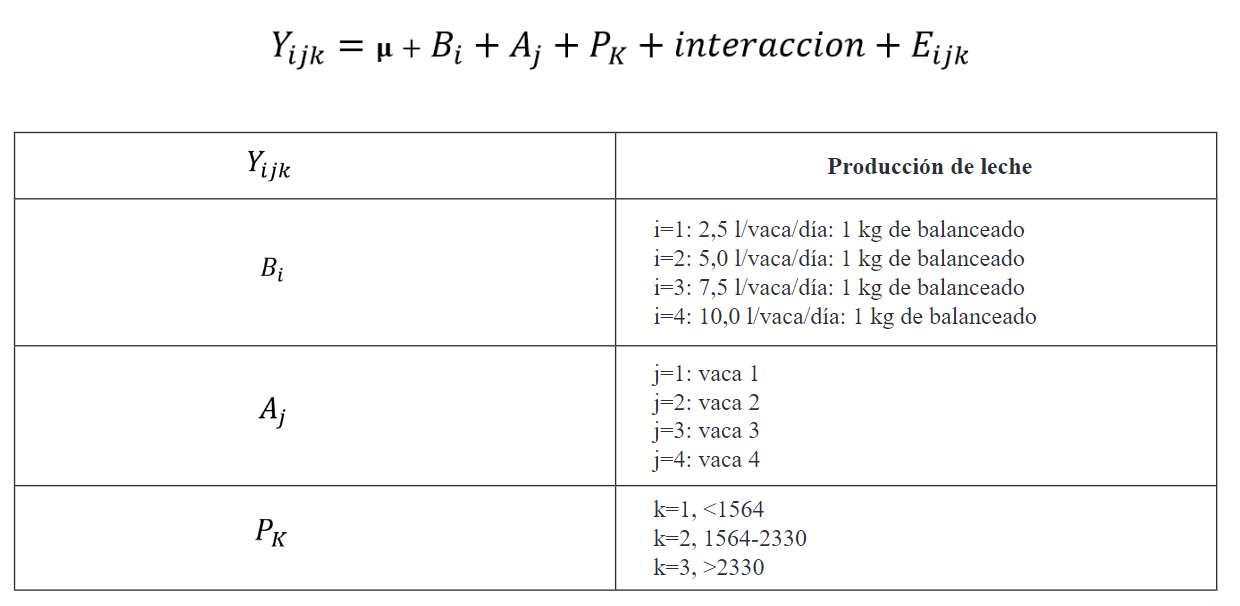 La eficiencia de uso del balanceado se determinó utilizando la ley de rendimientos decrecientes (también llamada rendimientos marginales decrecientes): es la disminución marginal del incremento del producto o servicio (por unidad) en un proceso productivo conforme se añaden nuevos factores productivo (Hernández, 2017). Se relacionó la producción (L/vaca/día) con la cantidad de balanceado (kg/vaca/día) y se estimó la eficiencia de uso para cada uno de los tratamientos, aplicados de acuerdo con la siguiente fórmula: