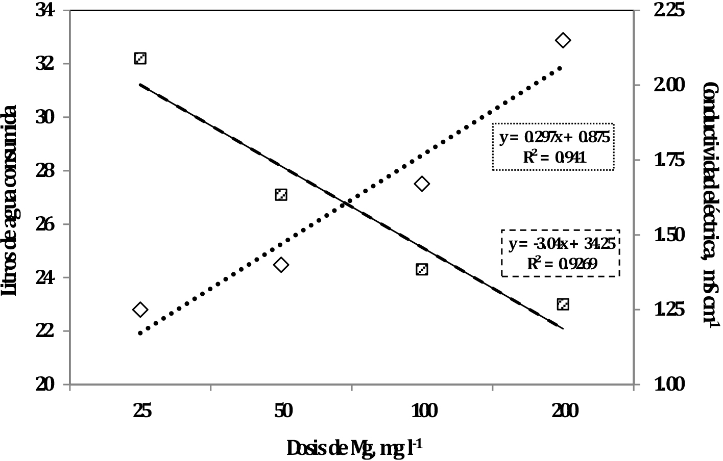 El consumo de solución nutritiva por la planta a lo largo del ensayo no fue afectado por la concentración de H3O+ (pH 4 y 6), pero sí se afectó por el incremento en la concentración de Mg en la solución. El consumo de solución nutritiva se redujo significativamente con la dosis de 200 mg l-1 de Mg (Tabla 1). El menor consumo de solución nutritiva por las plantas con la mayor concentración de Mg fue el primer efecto detectado. Se observaron diferencias estadísticamente significativas entre las plantas con menor dosis de Mg (25 mg l-1) y las con la dosis mayor (200 mg l-1) desde el inicio de la evaluación. El consumo de solución nutritiva con la dosis de 100 mg l-1 fue estadísticamente diferente del consumo con la dosis menor (25 mg l-1) a partir del día 31. No existieron diferencias estadísticamente significativas entre la dosis de 25 y 50 mg l-1. El consumo de solución nutritiva por las plantas fue inverso a la concentración de Mg (Figura 1), debido probablemente al aumento de conductividad eléctrica de la solución nutritiva al incrementar la concentración de Mg, condición que ocasionó un menor consumo por parte de la planta, coincidiendo con los resultados encontrados por De Oliveira et al. (2000).