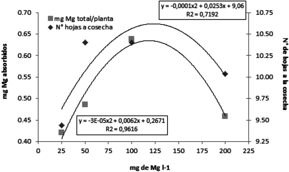 El incremento en la concentración de Mg de 25 a 50 mg l-1 afectó significativamente al número de hojas al momento de finalizar el experimento, posiblemente debido a que el incremento en concentración de Mg aumenta su absorción en toda la planta (Figura 2), particularmente en las hojas inferiores de mayor edad lo que evita la senescencia prematura que ocurre cuando no hay suficiente Mg para redistribución de las hojas viejas a las nuevas. El número de hojas disminuyó con la utilización de dosis de Mg mayores de 100 mg l-1 probablemente debido al efecto del incremento de la conductividad eléctrica de la solución sobre las variables de crecimiento de la planta. El Mg es muy móvil en el floema y se puede translocar desde las hojas más viejas a las más jóvenes o a los ápices en tiempos cortos (días), lo que permite que la planta no detenga su crecimiento y la redistribución de Mg de las hojas viejas a las nuevas favorece la senescencia normal de las hojas más viejas (Schimansky, 1973; Steucek & Koontz, 1970).