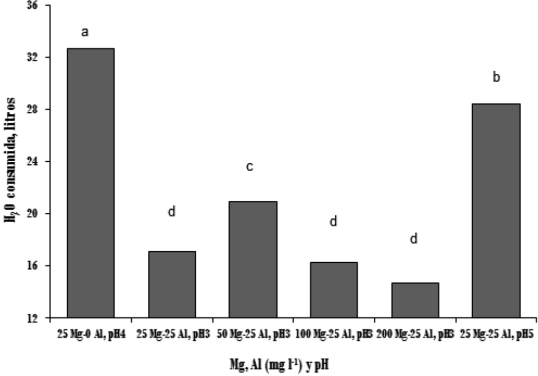 El consumo de agua se determinó aforando los potes a 19 litros con solución nutritiva, se determinó la masa del pote + solución nutritiva al inicio y final de cada ciclo de sustitución (3 y 4 días) y la diferencia de masa correspondió al consumo de agua en litros por la planta en dicho período. El consumo total de agua se obtuvo a partir de la sumatoria de agua consumida en cada ciclo de sustitución de la solución nutritiva. El pH de la solución se midió con el método del potenciómetro (Westerman, 1990) y se controló cada 24 horas y se ajustó siempre que la lectura presentara una desviación de -0,17 y + 0,3 de unidad de pH mediante la adición de KOH 0,5M y HCl concentrado, según fuera el caso.