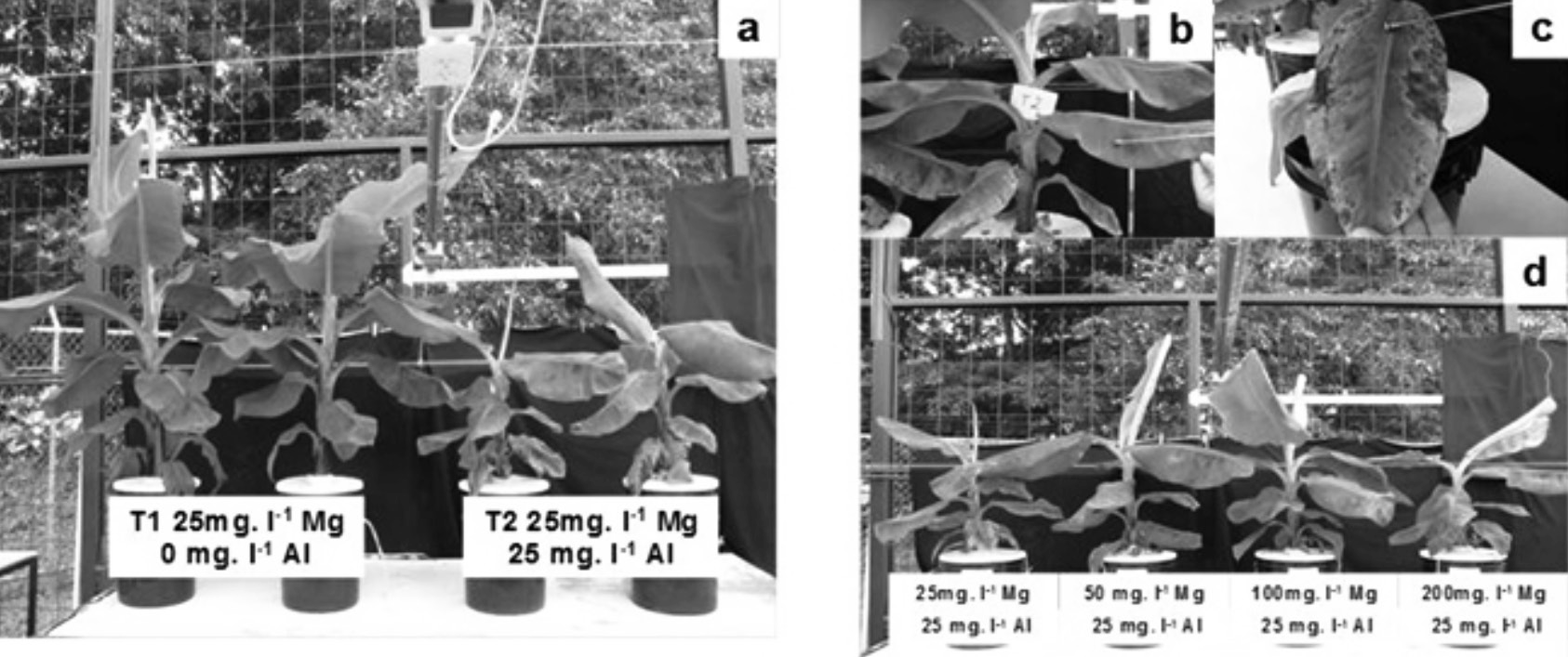 Los principales síntomas observados en las plantas creciendo en la solución nutritiva con Al con la menor dosis de Mg (25 mg l-1) fueron los siguientes: clorosis marcada a nivel de las hojas inferiores y reducción en el distanciamiento entre los pseudo pecíolos (Figura 3a). Como consecuencia de lo anterior, las plantas se tornaron más compactas (tipo roseta) y se observó una obstrucción foliar (arrepollamiento), lo que a su vez provocó una reducción de la altura en las plantas. De igual forma, las hojas de las plantas creciendo en solución nutritiva con Al fueron de menor tamaño y el pseudo tallo tuvo menor circunferencia. La reducción del tamaño de la hoja y de la distancia entre pseudo pecíolos es una respuesta del banano al déficit de agua (Turner, 1972). Síntomas similares fueron observados por Rufyikiri et al. (2001) quienes sugirieron que estos efectos pueden resultar de la reducción de crecimiento y de actividad radicular inducidos por la presencia de Al, condición que hace que la planta absorba menos agua.