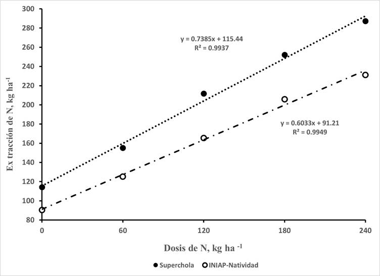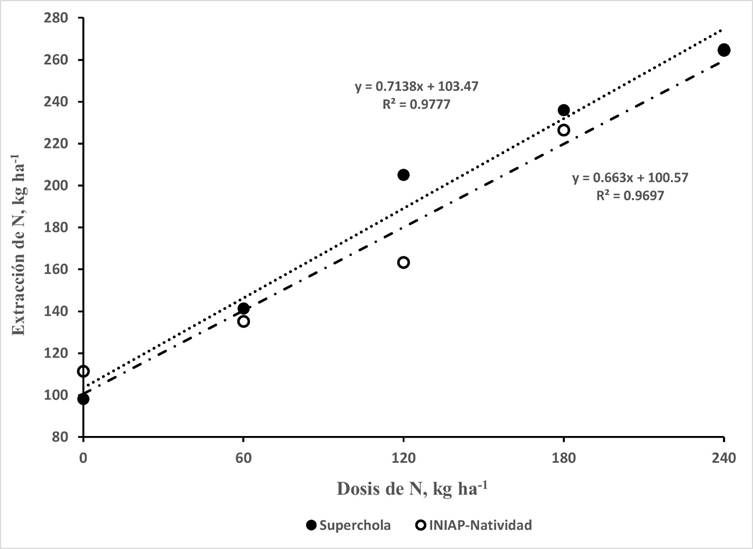 Los resultados de la extracción de N por el cultivo de papa a las dosis crecientes de N aplicadas al suelo en Cortijo Bajo y Chañag se presentan en las Figuras 1 y 2, respectivamente. Se observó que la extracción de N aumenta en forma lineal con el incremento en la dosis de N en las dos variedades; es decir, que la planta absorbió en proporción directa a las cantidades de N suministradas hasta la dosis más alta (240 kg N ha-1). Las plantas no pueden absorber nutrientes indefinidamente y la respuesta lineal en extracción de N hasta la dosis de 240 kg N ha-1 sugiere que la papa cultivada en estos suelos podría seguir absorbiendo N a dosis más altas hasta saturar su capacidad de absorción y mostrar una respuesta cuadrática. Mucho del N absorbido por la planta a altas dosis de aplicación del nutriente al suelo es consumo de lujo y no aporta al rendimiento (White, 2012).