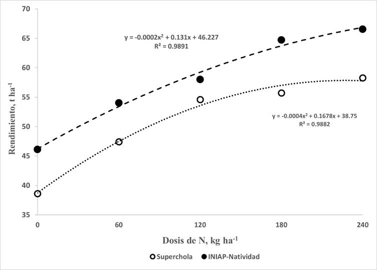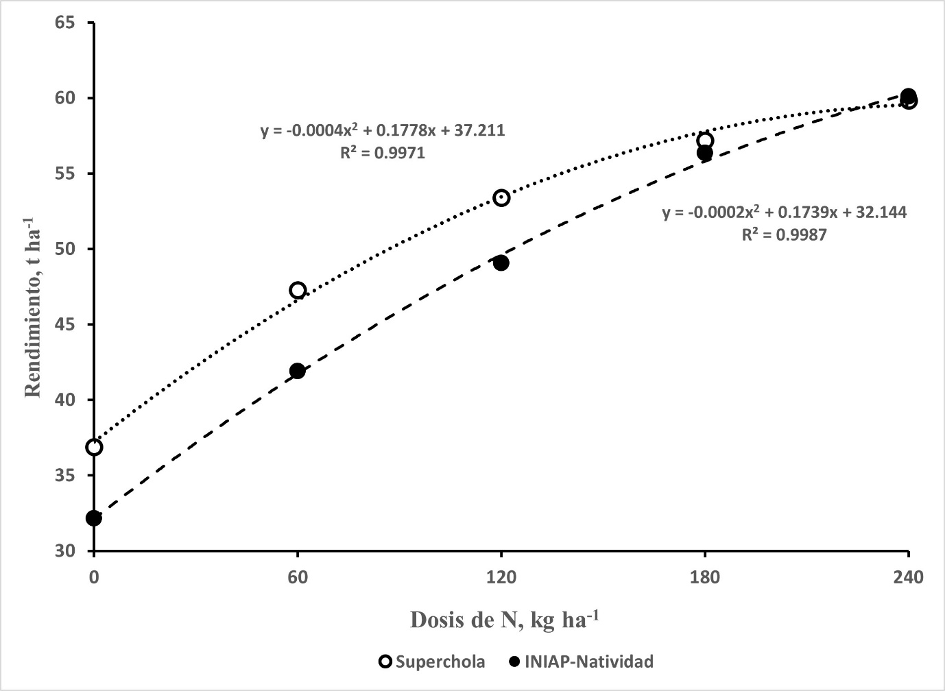 Con los valores de las curvas de rendimiento, se puede calcular la dosis óptima fisiológica [DOF] (el punto más alto de la curva) que indicaría la dosis de N necesaria para lograr ese rendimiento, valor que pasaría a ser la recomendación de N para el sitio. Sin embargo, estos valores son casi siempre muy altos al no considerar la EUN. En este estudio, los valores calculados de DOF para las variedades Superchola e INIAP-Natividad para Cortijo Bajo fueron de 227 y 538 kg de N ha-1; respectivamente. Los datos altos e irreales obtenidos para INIAP-Natividad se deben a que el cálculo debe encontrar el punto teórico más alto de la curva de respuesta que continúa creciendo luego de la última dosis de N evaluada en el experimento (240 kg N ha-1). Lo mismo sucede en la localidad de Chañag (Figuras 3 y 4). Como se observa, es difícil utilizar la DOF como el valor para la recomendación de fertilización de N para el cultivo de papa en el dominio de recomendación de los sitios estudiados. Oyarzún et al. (2002), consideran que el valor de la DOF para las zonas paperas de las provincias de Pichincha, Cotopaxi, Carchi y Cañar es de 160 kg de N ha-1, que quizá sea un valor más real, pero que incluye a todas las variedades y todos los dominios de recomendación de las zonas de producción de papa en la Sierra Norte de Ecuador.