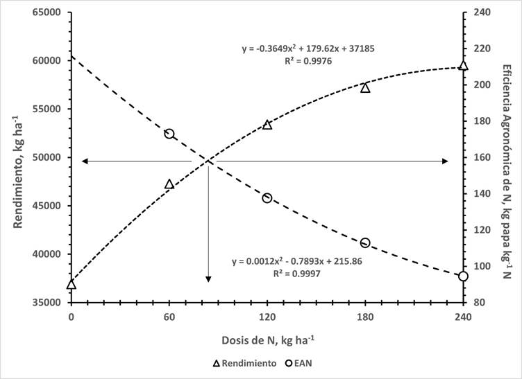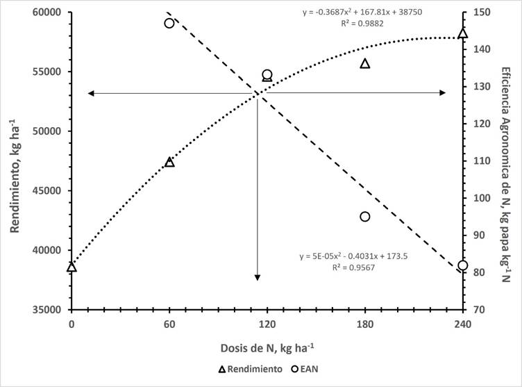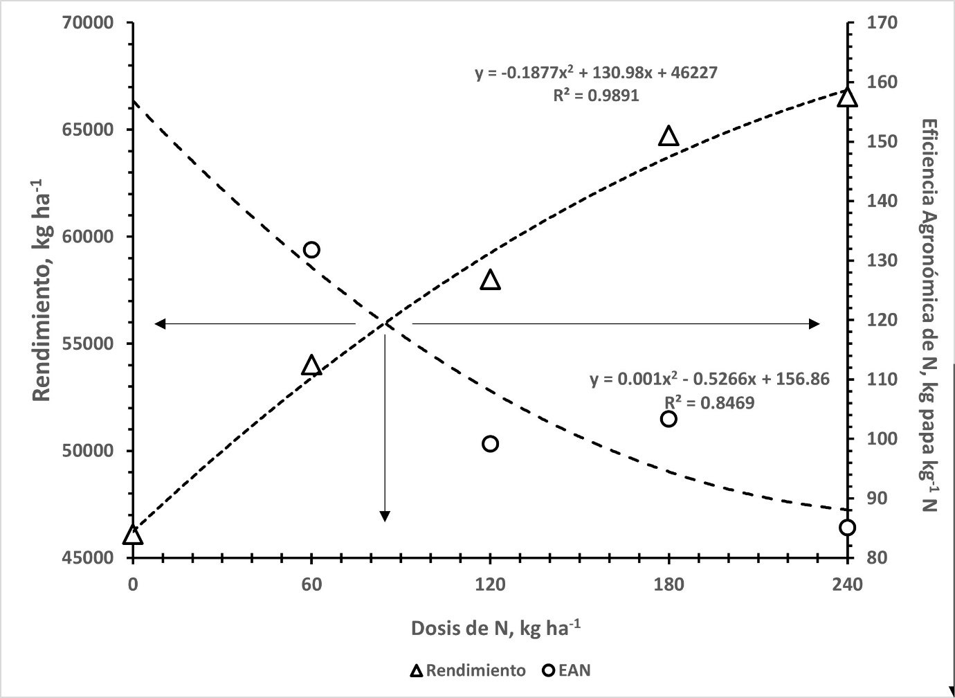 Adicionalmente, se utilizó el método gráfico para estimar la EA, donde se contrasta la curva de rendimiento con los valores de la eficiencia agronómica con las dosis evaluadas, por lo tanto, la EAN a utilizarse se localiza en el punto que esta empieza a decrecer. Este punto se localiza en la intercepción de la curva de la EA y la curva de rendimiento.