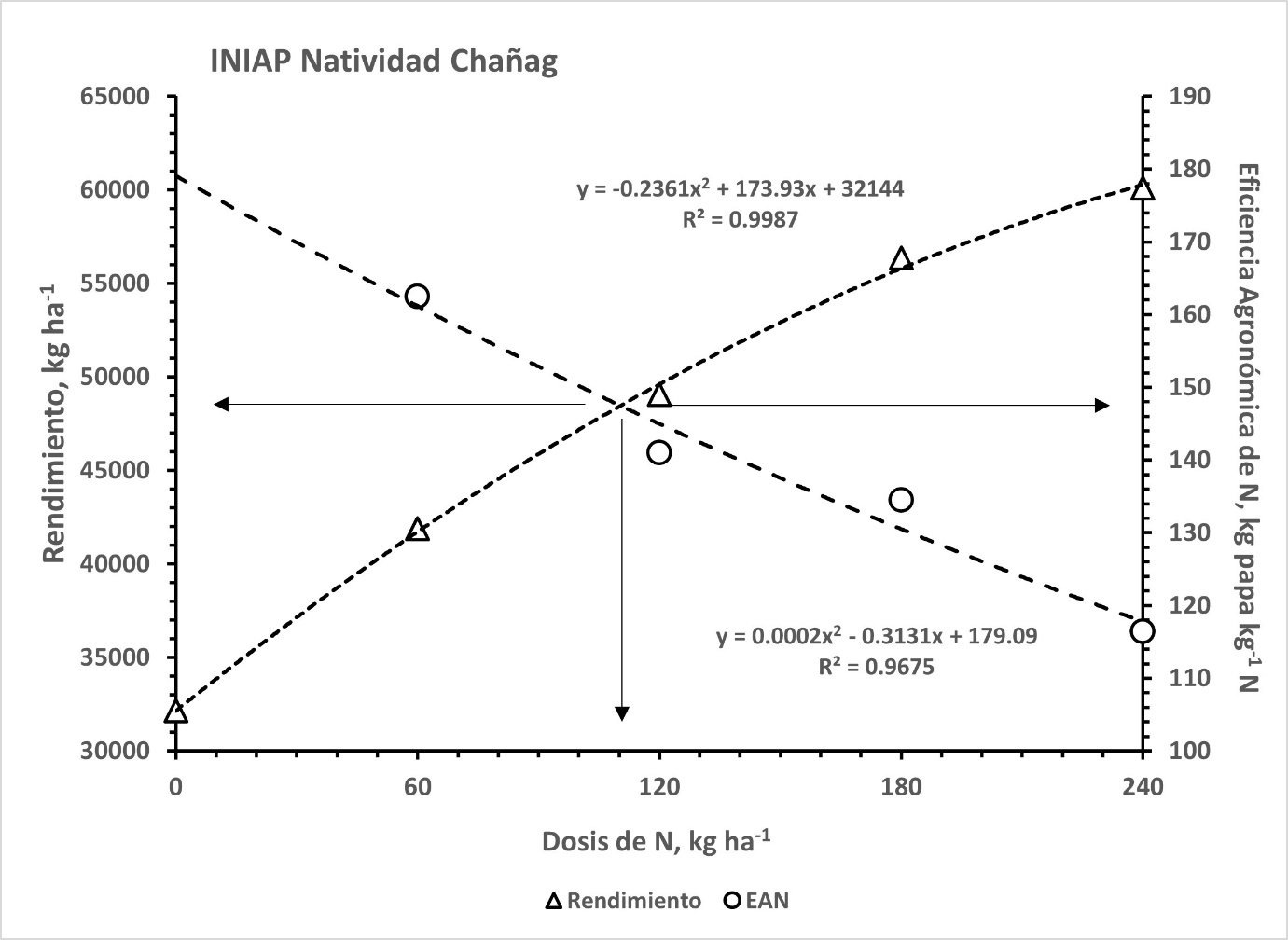 La meta de rendimiento de la variedad Superchola en Chañag (Figura 6) estaría alrededor de 50.000 kg ha-1, que la EAN sería de 160 kg de papa kg-1 de N y que la dosis de N recomendada para la siguiente siembra en el sitio sería de 80 kg N ha-1. En la Figura 7 se observa que la meta de rendimiento de la variedad INIAP-Natividad en Cortijo Bajo sería de alrededor de 55.000 kg ha-1, que la EAN sería de 120 kg de papa kg-1 de N y que la dosis de N recomendada para la siguiente siembra en el sitio sería de 80 kg N ha-1. En la Figura 8 se observa que la meta de rendimiento de la variedad INIAP-Natividad en Chañag es de alrededor de 50.000 kg ha-1, que la EAN es de 150 kg de papa kg-1 de N y que la dosis de N recomendada para la siguiente siembra en el sitio sería de 110 kg N ha-1.