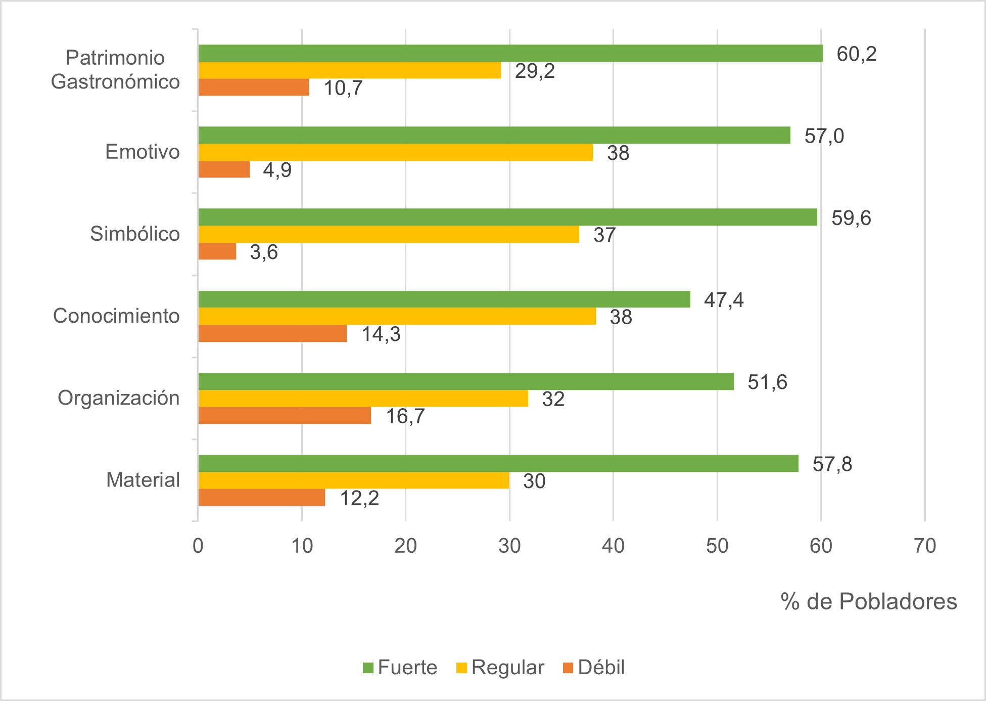Con respecto al desarrollo social y el patrimonio gastronómico el 66 % de la población lo identifican como débil. Los indicadores deben ser trabajados para mejorar ya que tienen conexión con el desarrollo económico. Según Draskovic et al. (2017, p. 326) es muy importante la relación entre el desarrollo económico y social; así también esta debilidad es registrada por Fernández et al. (2009, p. 299) quienes afirman que en España se presentan destinos turísticos no desarrollados, especialmente en el sector turístico hotelero. Los indicadores tratados igual son una debilidad en relación con otros sectores de producción. Y, por último, el desarrollo institucional local es percibido por el 77 % como débil por la falta de gestión del patrimonio gastronómico, como es también el caso de la Argentina (Navarro y Schlüter, 2010, p. 925) donde la comunidad de Tomás Jofré manifiesta un grado muy bajo de gestión por parte de las autoridades creando descontento, desorden y limitando el progreso local.