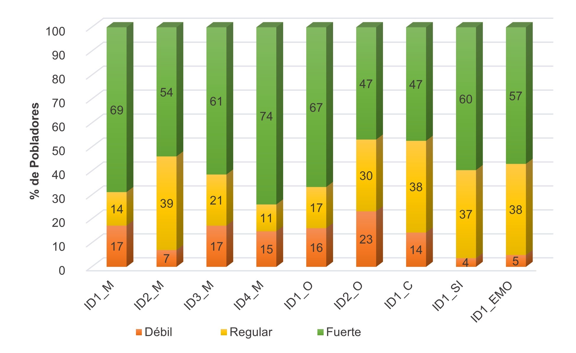 En la Figura 2 se puede observar las dimensiones del patrimonio gastronómico (ID1_M Materias primas; ID2_M Tierra; ID3_M Herramientas y utensilios; ID4_M Productos manufacturados; ID1_O Fiestas tradicionales; ID2_O Producción colectiva de alimentos, cualquier manifestación grupal; ID1_C Transmisión de conocimiento, puede ser vía oral; ID1_SI Significados; ID1_EMO Emotivo) y de entre dichas dimensiones dos muestran valores bajos, es decir, de debilidad significativa. Ellas son el indicador dos de la dimensión organización (ID2_O) y la dimensión conocimiento con su único indicador (ID1_C), así se ve que las dos dimensiones presentan valores de debilidad a criterio de más de cinco de cada diez pobladores, por lo que serían aspectos a considerar para una mejora, los otros indicadores fluctúan en valores medios altos, pero no ideales (Figura 2).