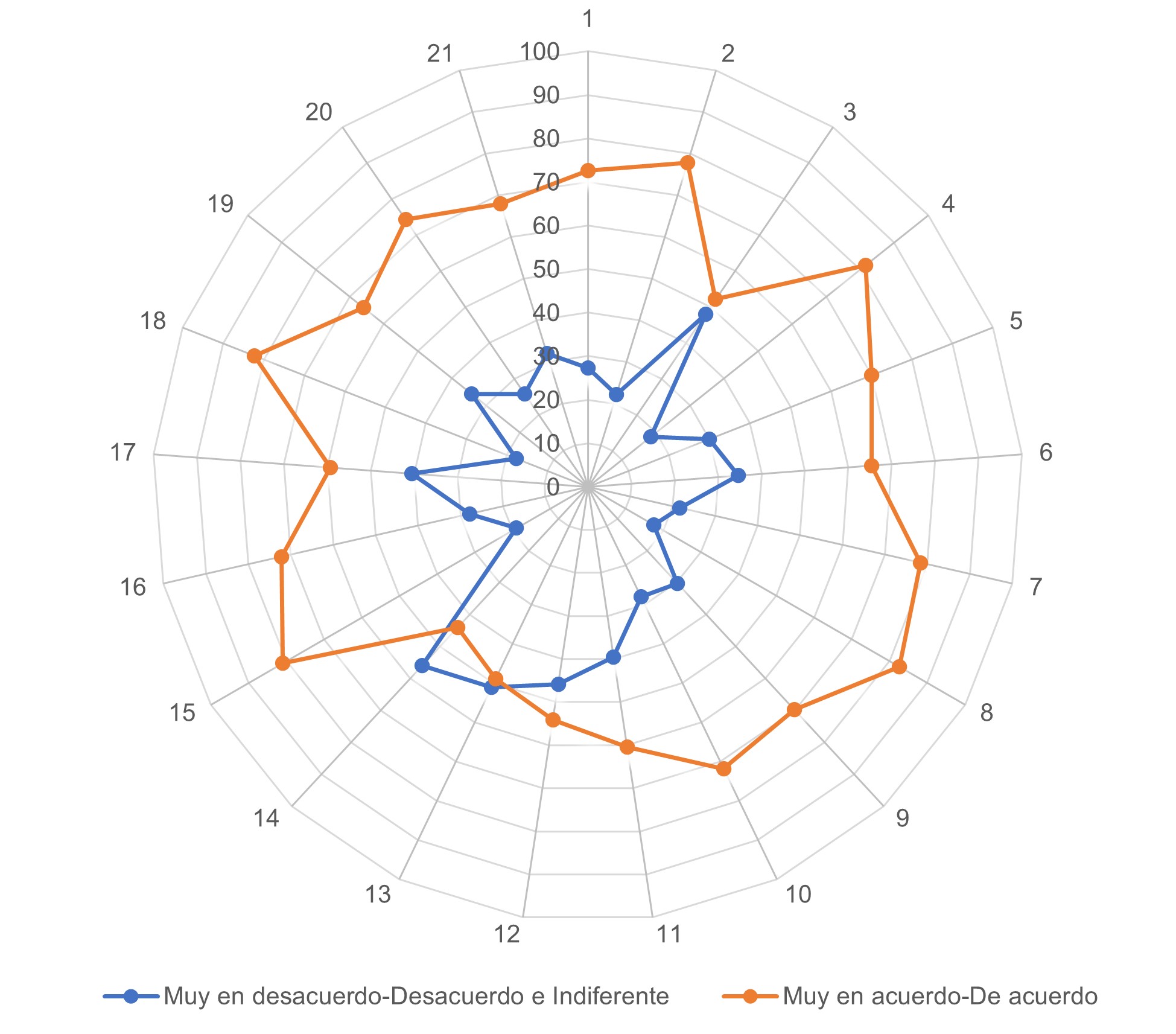 En la Figura 3 se pueden observar las valoraciones obtenidas para los 21 ítems que fueron presentados a los pobladores: