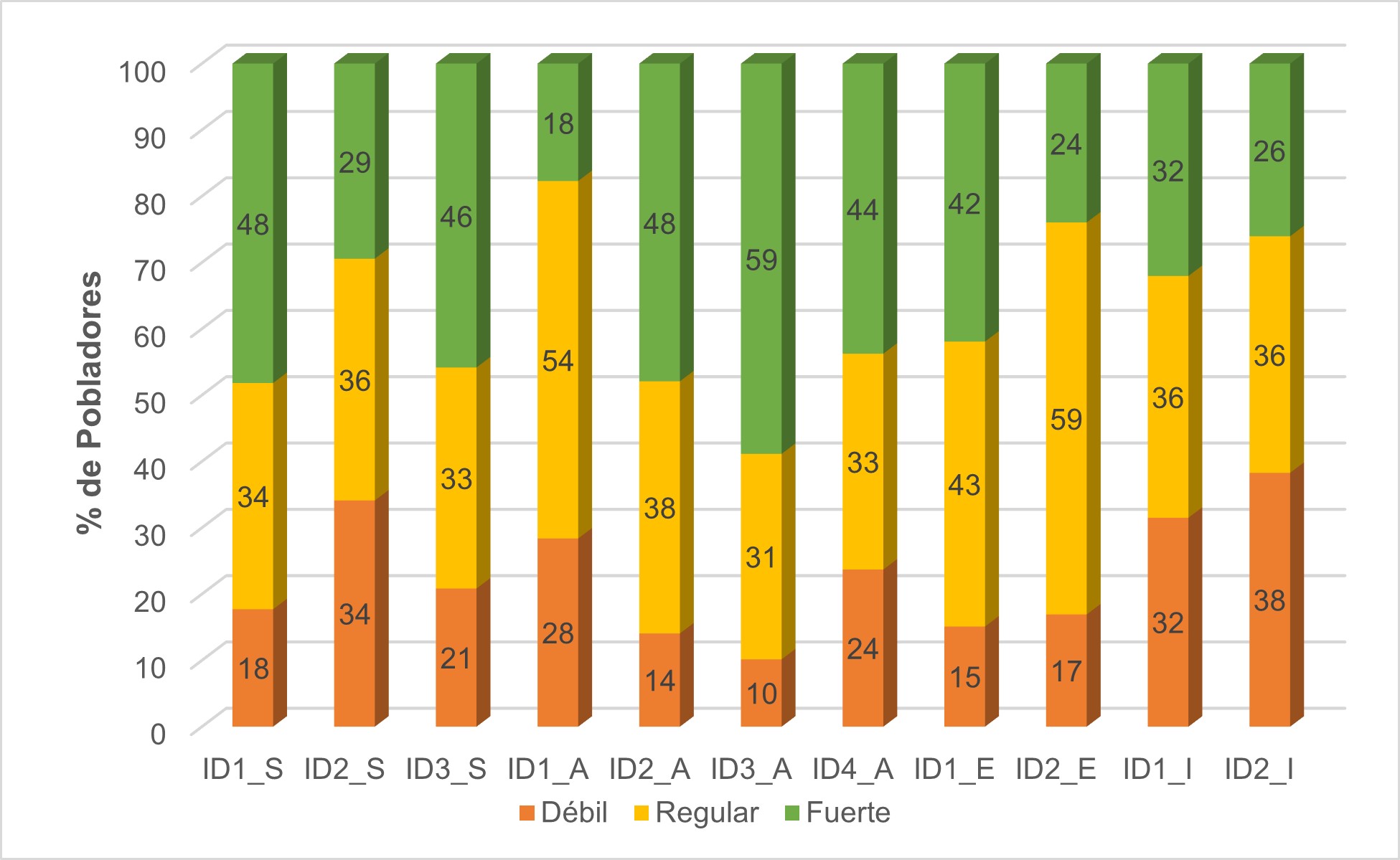 Se puede observar en la Figura 5, ya por dimensiones e indicadores referentes al desarrollo sostenible de los tres indicadores de la dimensión social (ID1_S Desempleo, ID2_S Igualdad salarial entre géneros, e ID3_S Acceso al cuidado de la salud), que todos deben ser atendidos, pero el aspecto de la igualdad salarial es percibido por siete de cada diez pobladores en estado de debilidad y regular. Por otro lado, la dimensión ambiental (ID1_A Emisiones de gases de efecto invernadero, ID2_A Área de cultivo permanentes, ID3_A Uso de pesticidas, e ID4_A Pesca anual de especies mayores) presenta sus indicadores como un riesgo, mostrando el caso más representativo el indicador emisión de gases de efecto invernadero como un estado de debilidad o regularidad por ocho de cada diez pobladores. El indicador área de cultivos permanente es evaluado como débil y regular con un poco más de cinco de cada diez habitantes.