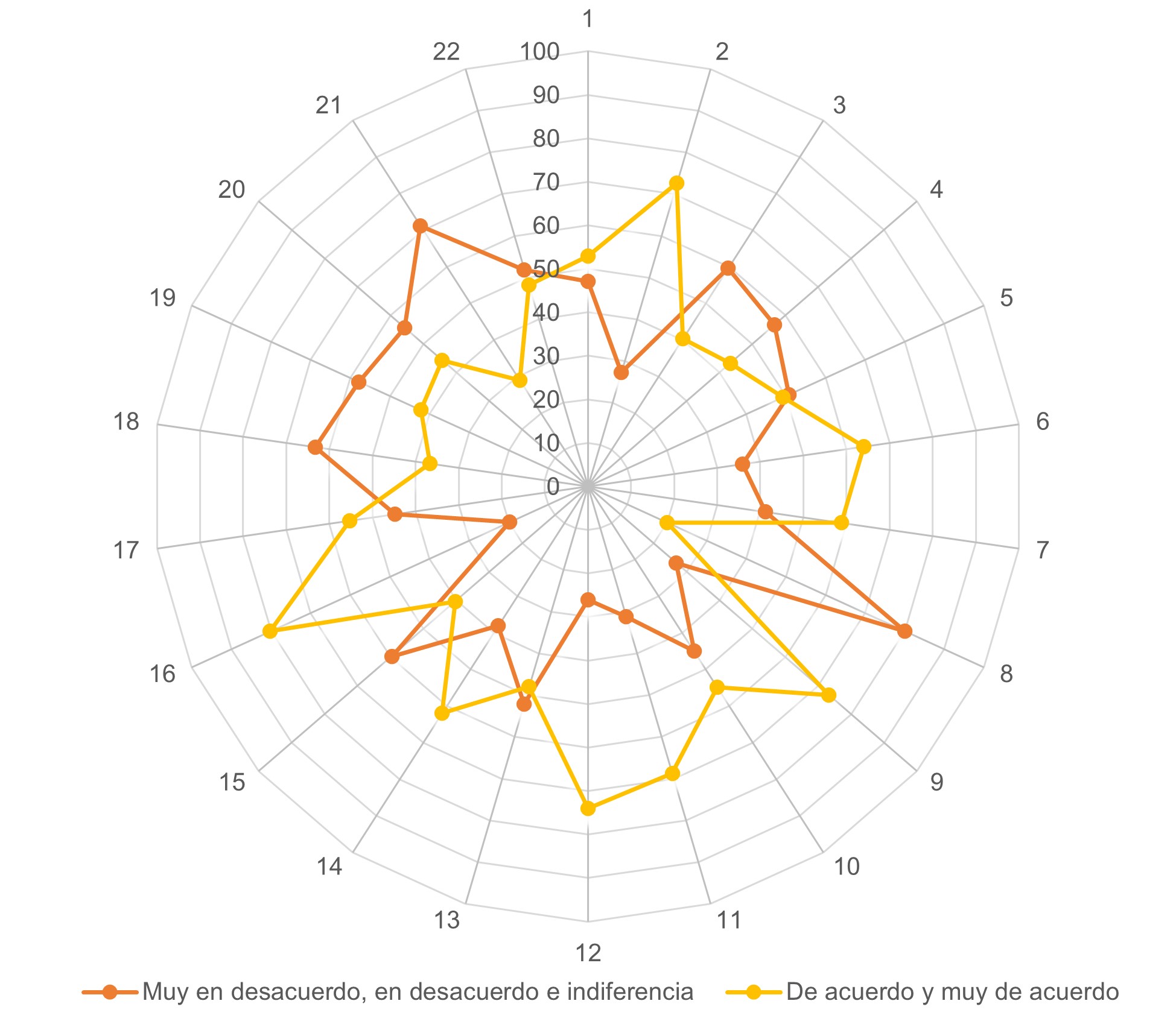 En la Figura 6 se visualizan los resultados del segundo instrumento, el cual recoge información por medio de 22 ítems:
