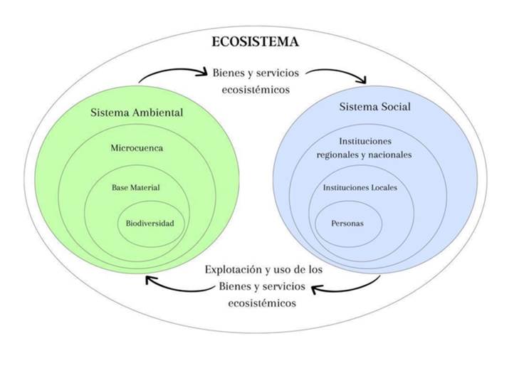 Se concibe el objeto de estudio –ecosistema de altura Cochapata– como un sistema complejo constituido por personas y naturaleza profundamente entrelazadas y en evolución. Este, a su vez contiene subsistemas, cuyos flujos producen interacciones que resultan en alteraciones socio-ambientales, intereses distintos, relaciones de poder y condiciones de vulnerabilidad. Los subsistemas, ambiente, agroproductivo (campesino e industrial) e hidrológico, se relacionan internamente y con el entorno (lo que se dejó fuera del sistema). Así, materia (biomasa), energía (trabajo, insumos) y agua fluyen dentro y fuera del ecosistema, a favor de uno o de otro demandante.