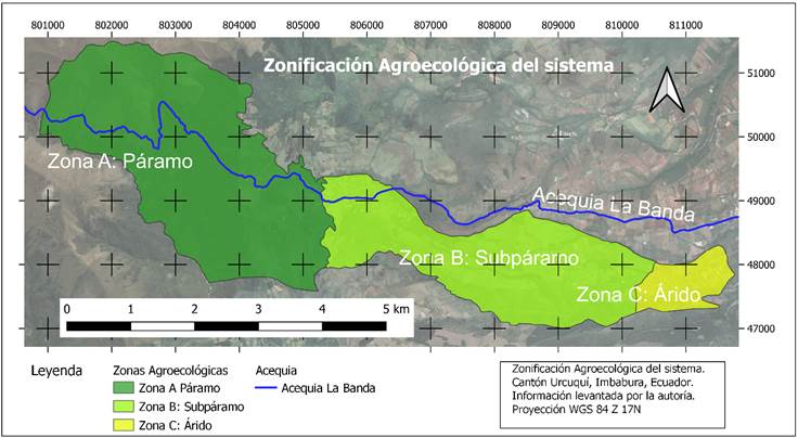 Para la investigación se definió el ecosistema como un corte de microcuenca alta. Se realizó la zonificación agroecológica con base en la altitud, lectura del paisaje y uso del suelo: Zona A: correspondiente al páramo, contiene vegetación natural de pajonal, infraestructura de CELEC E.P. (Ministerio de Energía y Minas, 2019), y el monocultivo de pino implantado por las industrias madereras y hacienda Añaburo. Zona B: subpáramo, contiene cultivos y pastos de altura manejados por los pobladores campesinos de Cochapata, monocultivos de pino y de eucalipto. Zona C: los áridos de las comunas Azaya y Ajumbuela, cultivos sin riego, de granos básicos y pequeñas huertas (Figura 3).