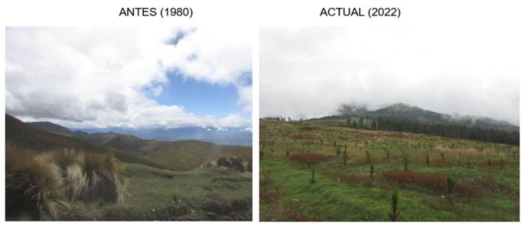 Es evidente la ocupación del páramo de Cochapata por parte del extractivismo maderero. Fotografías del páramo Pucará en 1980 y 2022 muestran la transformación del ecosistema (Figura 4).