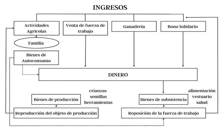 Para el estudio del aspecto económico se sumaron los ingresos anuales: bono solidario de $70, 00 (siempre a nombre de la mujer), el ingreso del hombre como jornalero en la zona baja $240,00 venta del ganado cebado $70.00 (una cabeza de ganado al año), las pequeñas ventas de las cosechas anuales no son significativas en el ingreso monetario. Se estimó que la familia (con un integrante como jornalero) pudo obtener un ingreso mensual de $385,00. Se relaciona este ingreso con el costo de la canasta básica familiar [CBF] del año 2021 que fue $716,14. Este ingreso es transformado en especies: compra de granos básicos a productores de otros pisos o aquellos que la familia no cultivó en la temporada, compra de ganado para el nuevo ciclo de engorde, semilla, abonos, animales de carga, herramientas. En la Figura 7 se muestra un esquema mental de lo indicado.