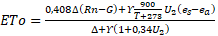 Donde, ETo = Evapotranspiración potencial mm día-1, Rn = Radiación neta en la superficie del cultivo MJ m-2 día-1, G = Flujo de calor en el suelo MJ m-2 día-1, Δ = Pendiente de la curva de presión de vapor kPa°C-1, Υ = Constante psicométrica kPa°C-1, T = Temperatura media °C, U2 = Velocidad del viento medida a 2 m de altura m s-1, Es = Presión de vapor de saturación kPa, ea = Presión real de vapor kPa.