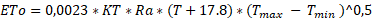 Donde, ETo = Evapotranspiración potencial mm día-1, Ra = Radiación solar entrante de onda corta mm d-1, Tmax = Temperatura máxima oC, Tmin = Temperatura mínima oC, KT = 0,162 para regiones internas y 0,19 para regiones costeras.