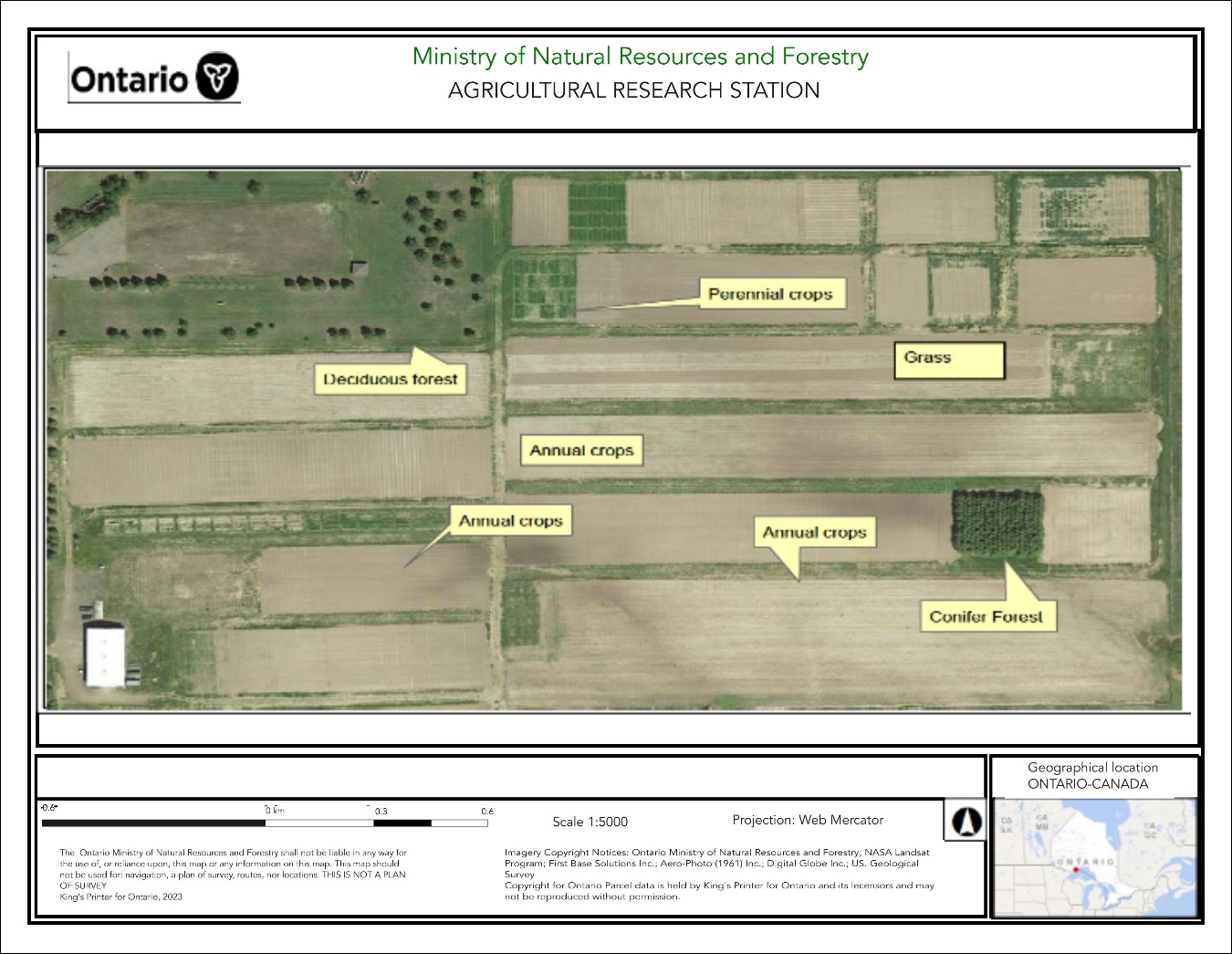 The study was conducted at Lakehead University Agricultural Research Station [LUARS] in Thunder Bay, Ontario, Canada, in 2019. LUARS is part of the Slate River area, where soils have been influenced by proglacial streams and subsequent deglaciation (Baldwin et al., 2000). The mean annual precipitation ranges from 700-850 mm, and the mean annual temperature ranges from -26 °C to -22 °C in January and 21 °C to 25 °C in July (Environment Canada, 1991).