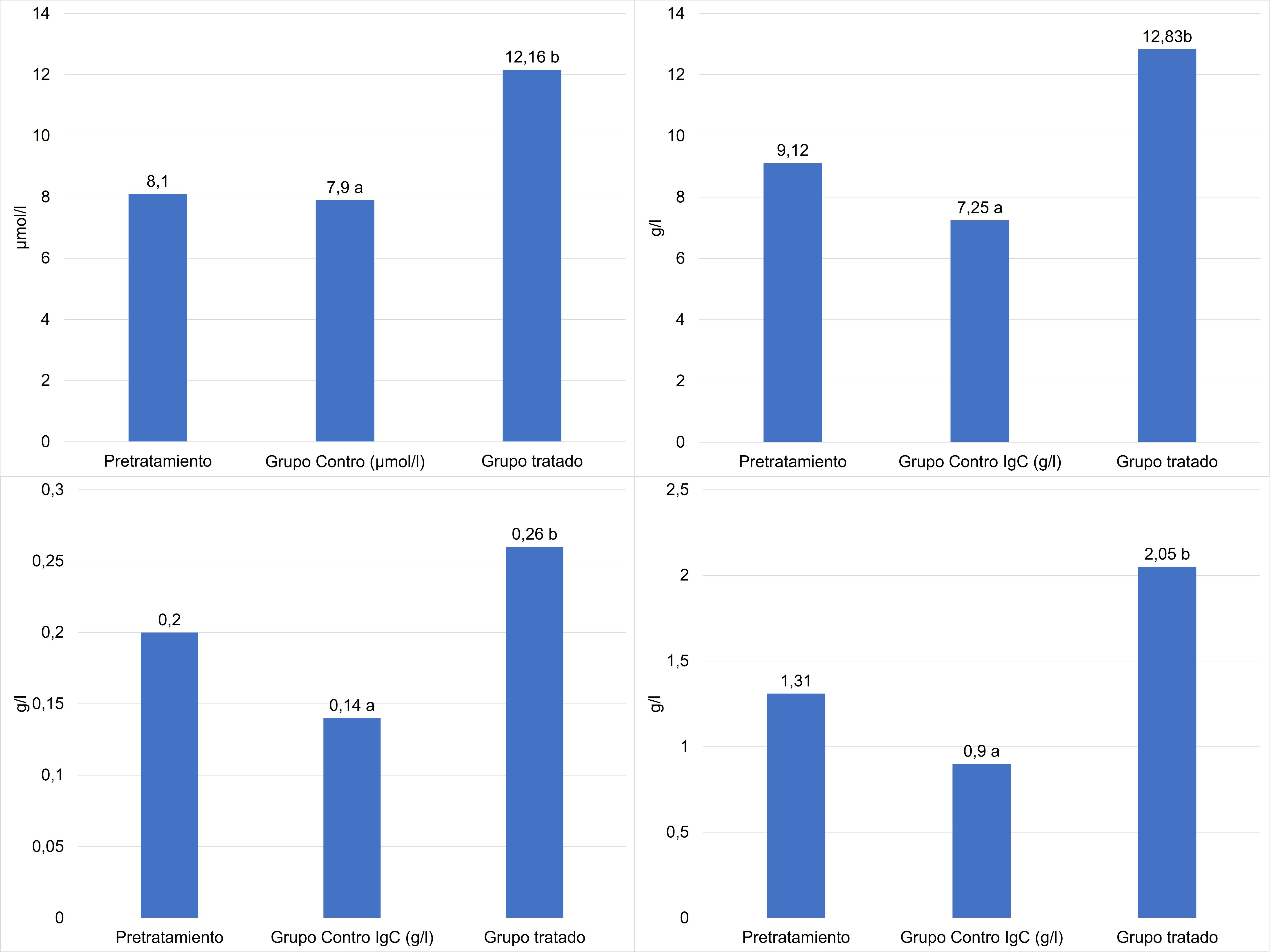 Figure 1. Effect of parenteral copper supplementation (50 mg) in hypocupraemic (mild) cows on immunoglobulin and copper levels in the blood serum of 5/8 Holstein x 3/8 Brahman cows in the tropics. different letters per column are significantly different at p < 0,05.