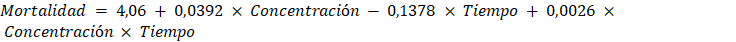 La evaluación de la mortalidad se realizó a partir de las 08h00 cada 4 h; para verificar que estuvieran muertas y no simplemente inmóviles, se utilizó un pincel fino para estimular su movilidad mediante contacto mecánico suave. Durante toda la fase de laboratorio se mantuvo las condiciones controladas de temperatura 28±2 °C y humedad relativa 80-90%. Para los cálculos de mortalidad se utilizó la ecuación [2].